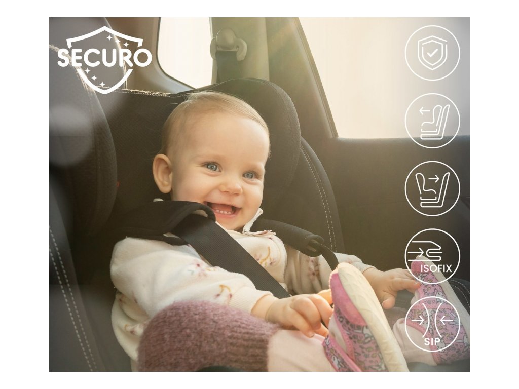 Autosedačka Securo je navrhnutá pre deti s výškou 40–150 cm a spĺňa prísnu normu i-Size (ECE R129),