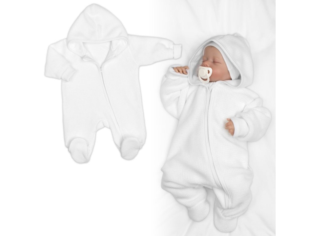 Pletený overal s kapucňou, CUTE - je nádherný kúsok oblečenia, ktorý kombinuje tradičné teplo pleteniny s moderným, rozkošným dizajnom. Je ideálny pre prvé prechádzky, cestovanie v autosedačke, alebo ako vrchná vrstva pre domáce leňošenie.