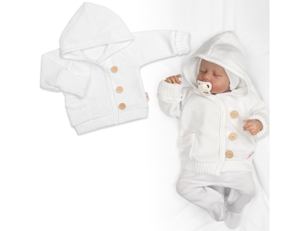 Rastúci pletený svetrík s kapucňou, zapínanie gombíkmi - biely