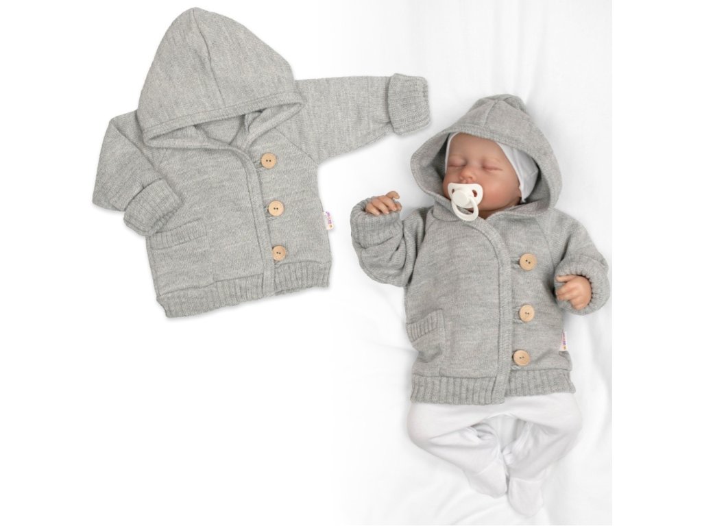 Štýlový a praktický kúsok, ktorý rastie spolu s vaším bábätkom. Svetrík má kapucňu a zapínanie na drevené gombíky, ktoré mu dodávajú