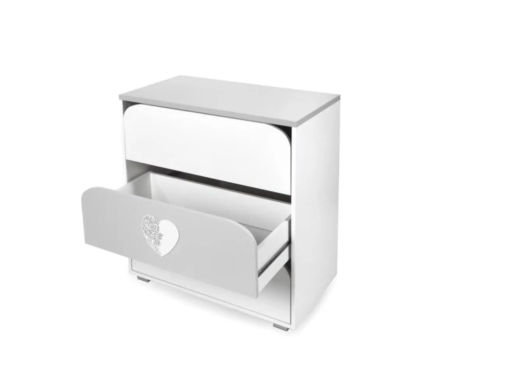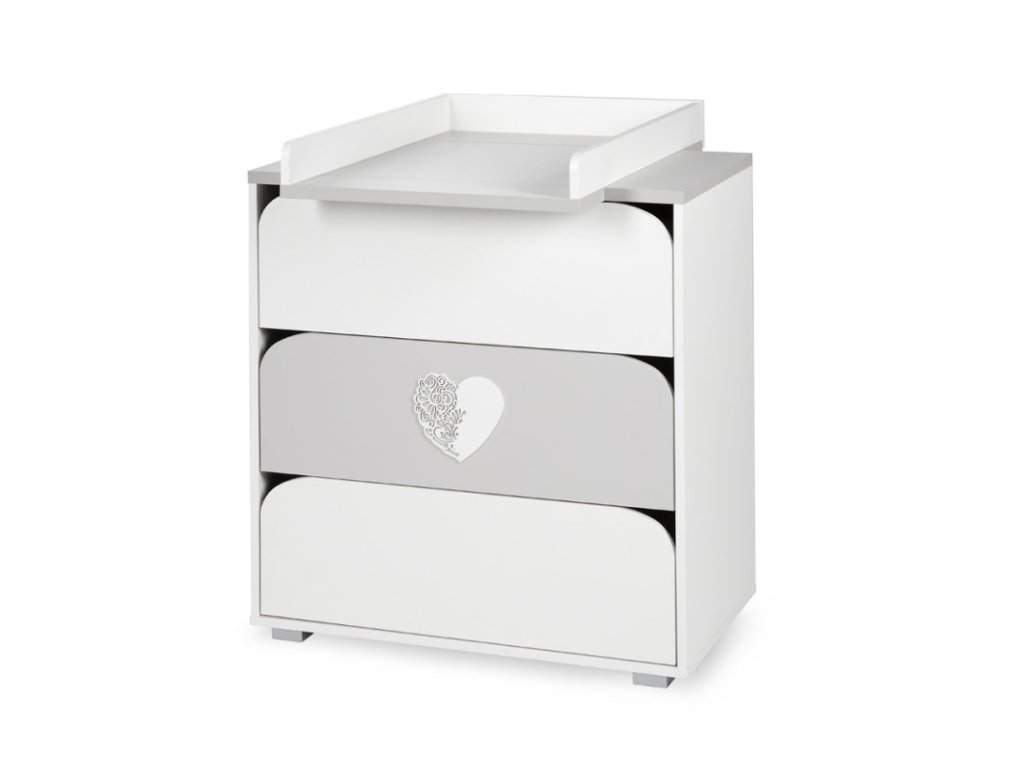 Komoda KLUPS s prebaľovacím pultom NEL srdce biela - v čistej bielej farbe s ikonickým motívom srdiečka nie je len štýlovým doplnkom do detskej izby, ale predovšetkým neoceniteľným pomocníkom pre každého rodiča.